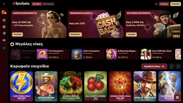 Καλώς ήρθατε στο SpinoGambino Casino, που λανσαρίστηκε το 2025 και σχεδιάστηκε για παίκτες που θέλουν γρήγορη πλοήγηση, πολλές επιλογές πληρωμών και ένα μεγάλο μενού παιχνιδιών σε ένα μέρος. Στο SpinoGambino, ο στόχος μας είναι απλός: να σας προσφέρουμε μεγάλη ποικιλία (6.000+ τίτλους), ξεκάθαρους κανόνες μπόνους και αξιόπιστη βοήθεια όταν τη χρειάζεστε. Οι παίκτες από την Ελλάδα μπορούν να χρησιμοποιούν EUR και να επιλέγουν ανάμεσα σε κάρτες, ηλεκτρονικά πορτοφόλια και κρυπτονομίσματα, με άμεσες καταθέσεις και γρήγορες αναλήψεις σε επιλεγμένες μεθόδους. Κρατάμε επίσης τα πράγματα πρακτικά στο κινητό, με ειδικές εφαρμογές τόσο για iOS όσο και για Android.