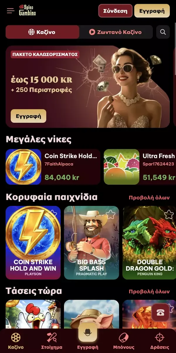 Χτίσαμε το SpinoGambino Casino ώστε να είναι πλήρες στο κινητό και όχι μια περιορισμένη έκδοση του site. Έχετε γρήγορη πρόσβαση σε μια μεγάλη βιβλιοθήκη περίπου 6000 τίτλων σε Φρουτάκια, Live Casino, Επιτραπέζια Παιχνίδια, Ειδικά Παιχνίδια και Στοιχήματα Αθλημάτων. Πολλοί παίκτες στην Ελλάδα επιλέγουν το κινητό για μικρές συνεδρίες, και η διάταξή μας το υποστηρίζει αυτό, είτε θέλετε λίγες περιστροφές, έναν γύρο σε live τραπέζι, είτε ένα γρήγορο αθλητικό στοίχημα.